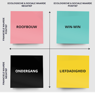 Een ander model met hetzelfde doel geleend uit het Finance vakgebied geeft op een iets andere manier handen en voeten heeft aan brede waarde. Wanneer een organisatie zowel negatieve financiële als ecologische-sociale waarde creëert, is dat onhoudbaar. Organisaties die alleen positieve ecologische-sociale waarde leveren, zoals NGO’s en stichtingen, opereren vaak zonder financieel rendement. De meeste bedrijven creëren financiële waarde ten koste van ecologische en sociale waarden; dit wordt roofbouw genoemd. Idealiter streven organisaties naar een win-win, waarbij zowel financiële als ecologische-sociale waarde wordt gecreëerd. Dit vraagt om een zorgvuldige balans, waarbij bedrijven hun bestaansrecht én bestaanszekerheid waarborgen. Hoewel het niet altijd haalbaar is, zouden bedrijven moeten streven naar positieve financiële waarde, het minimaliseren van negatieve ecologische-sociale impact en het compenseren van resterende schade. (Scharamade, 2022).