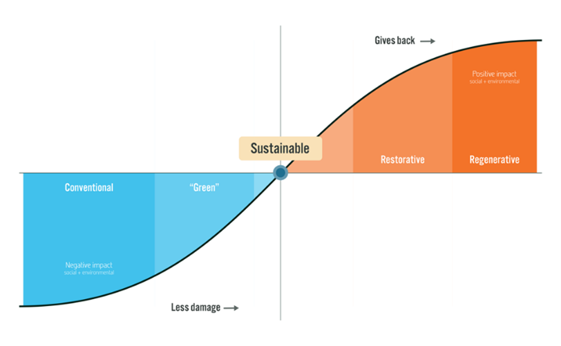 Deze afbeelding laat zien hoe organisaties zich kunnen ontwikkelen van conventionele strategieën, via verduurzaming, naar een herstellende en uiteindelijk regeneratieve aanpak. In de conventionele fase veroorzaken bedrijven vooral negatieve sociale en milieueffecten; denk aan klassieke olie- en gasbedrijven als ExxonMobil, die lange tijd weinig aandacht besteedden aan duurzaamheid. In de “green” fase proberen bedrijven hun schade te beperken, bijvoorbeeld door energiezuinige processen of afvalreductie—zoals Unilever, dat inzet op het verminderen van plastic en het verduurzamen van de keten, maar nog steeds een negatieve impact heeft door wereldwijde productie en distributie.